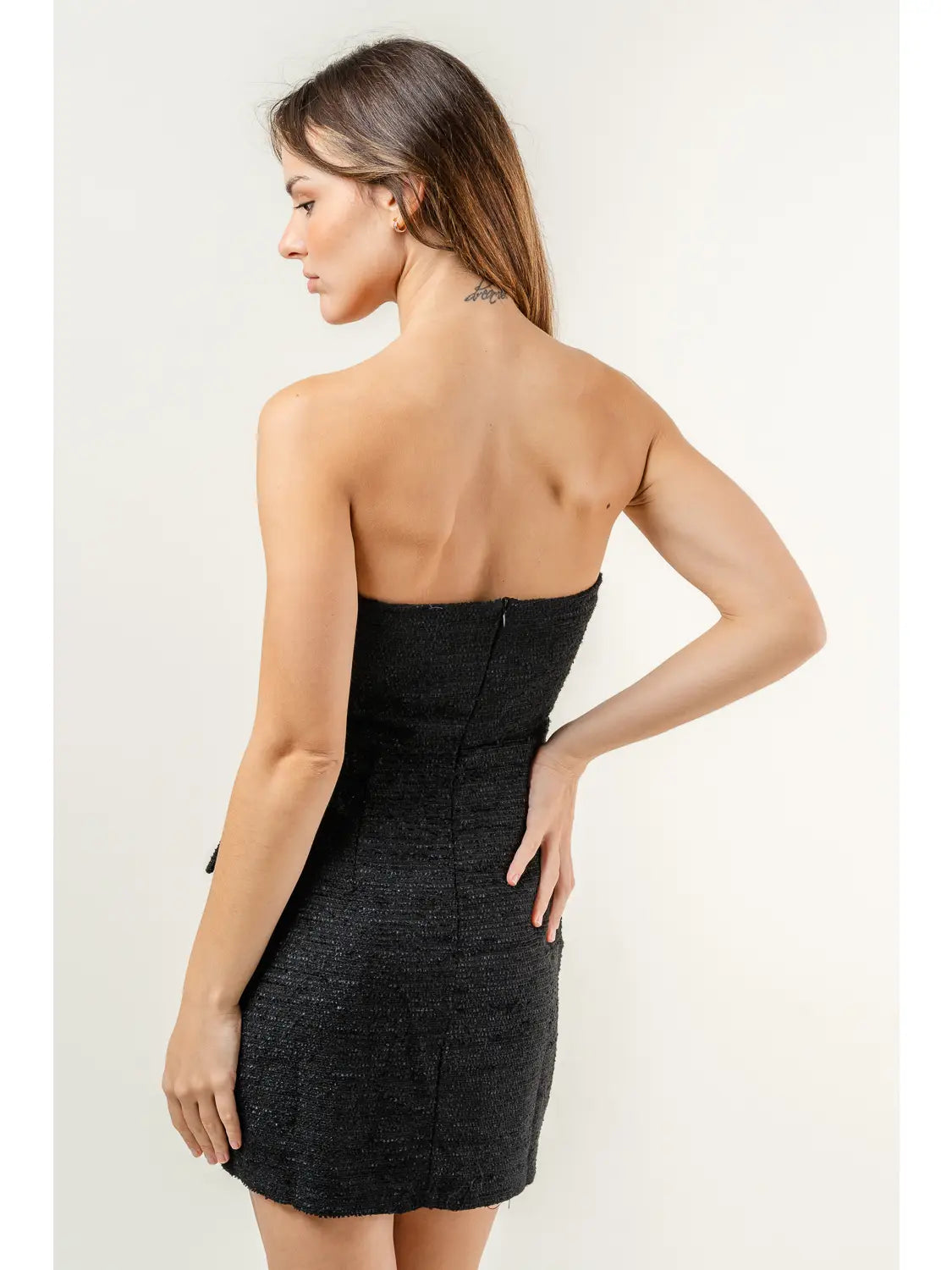 Turn heads in this Anna Tweed Mini Dress, perfect for any occasion. Featuring a strapless design with a fun twist of functional front pockets and button detailing. Made with tweed fabric, this dress is a must-have for the fall and winter season, perfect for transition from day to night. A versatile piece in classic black, perfect for a cocktail or evening event. Flirty and functional!