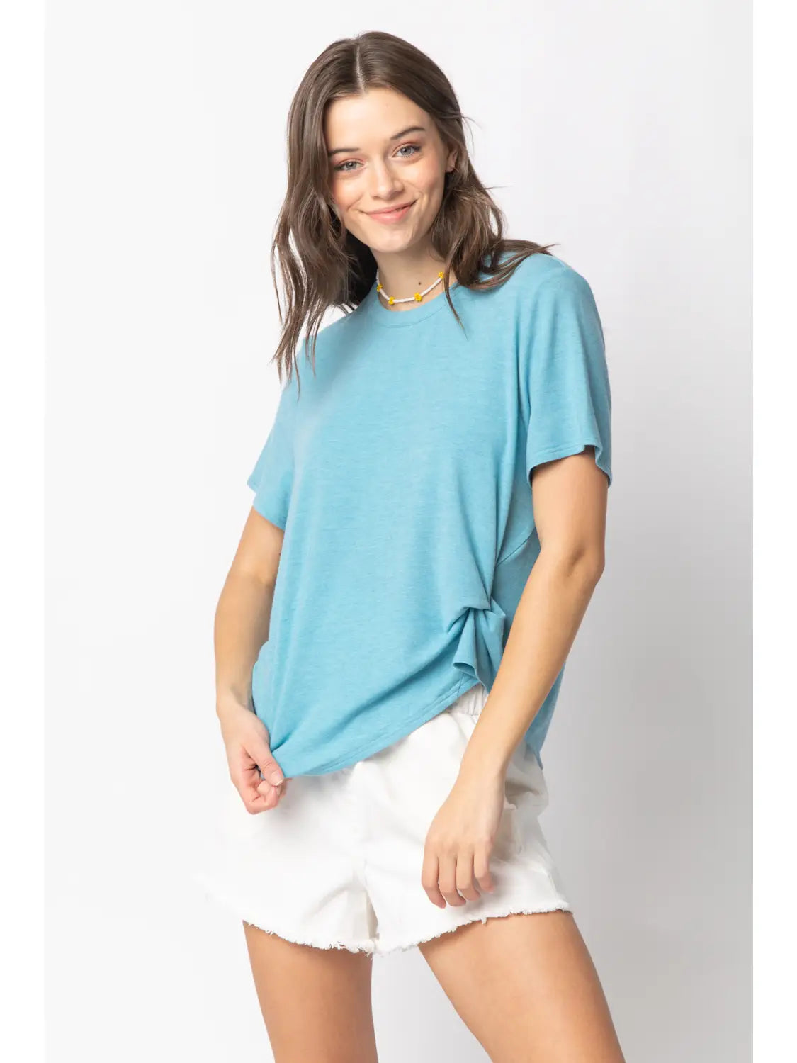Get ready to twist and shout in our Austin Tee! This short sleeve knit top features a playful twisted hem detail and soft heathered jersey fabric. With a classic crewneck, this shirt is perfect for any casual occasion. Don't miss out on adding some fun to your wardrobe!