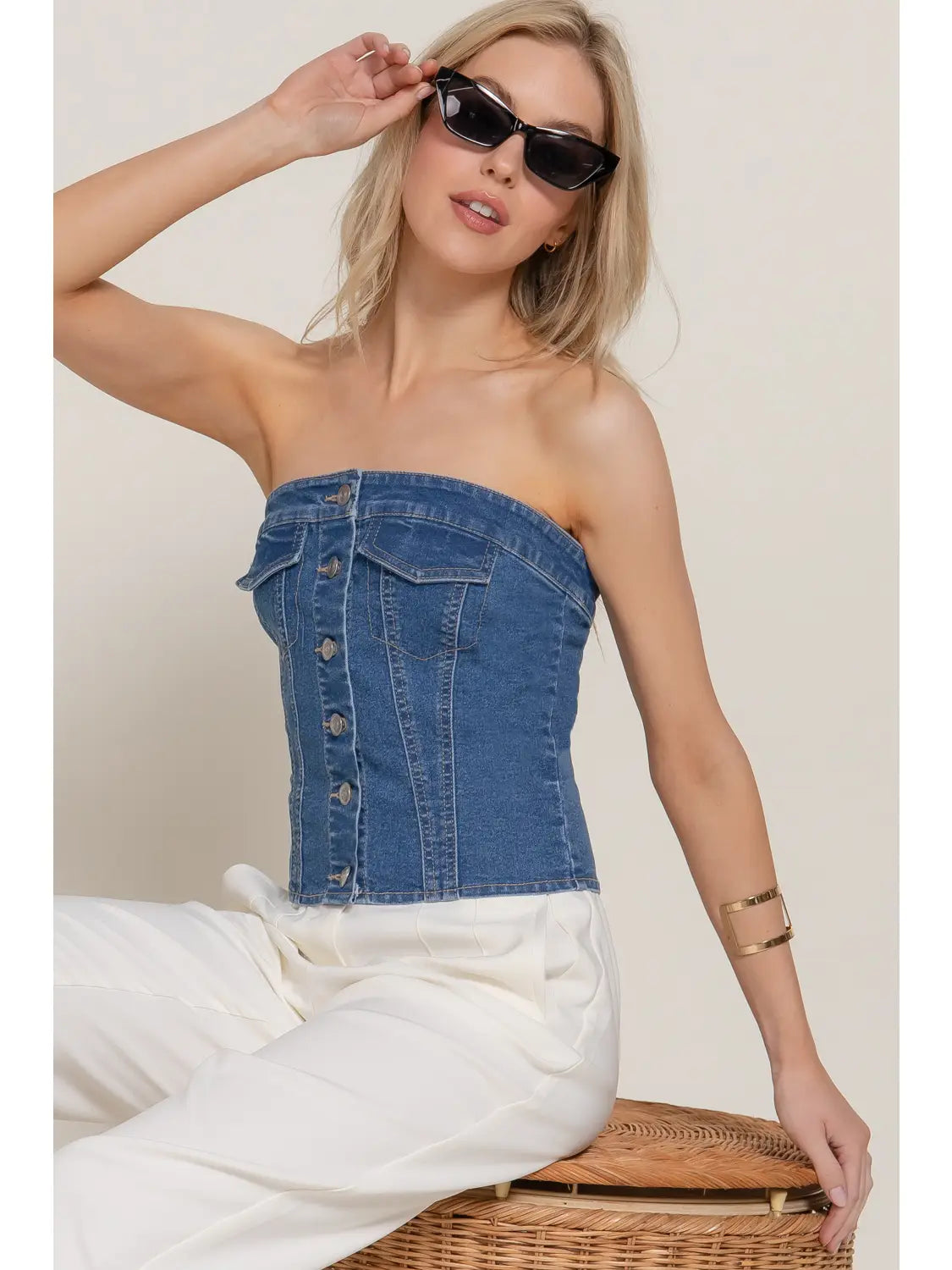 Unleash your inner cowgirl with this playful and stretchy denim tube top. The button down placket adds a touch of classic charm while the fabric, made of 75% cotton, 23% polyester, and 2% spandex, provides ultimate comfort and ease of movement. Yeehaw!