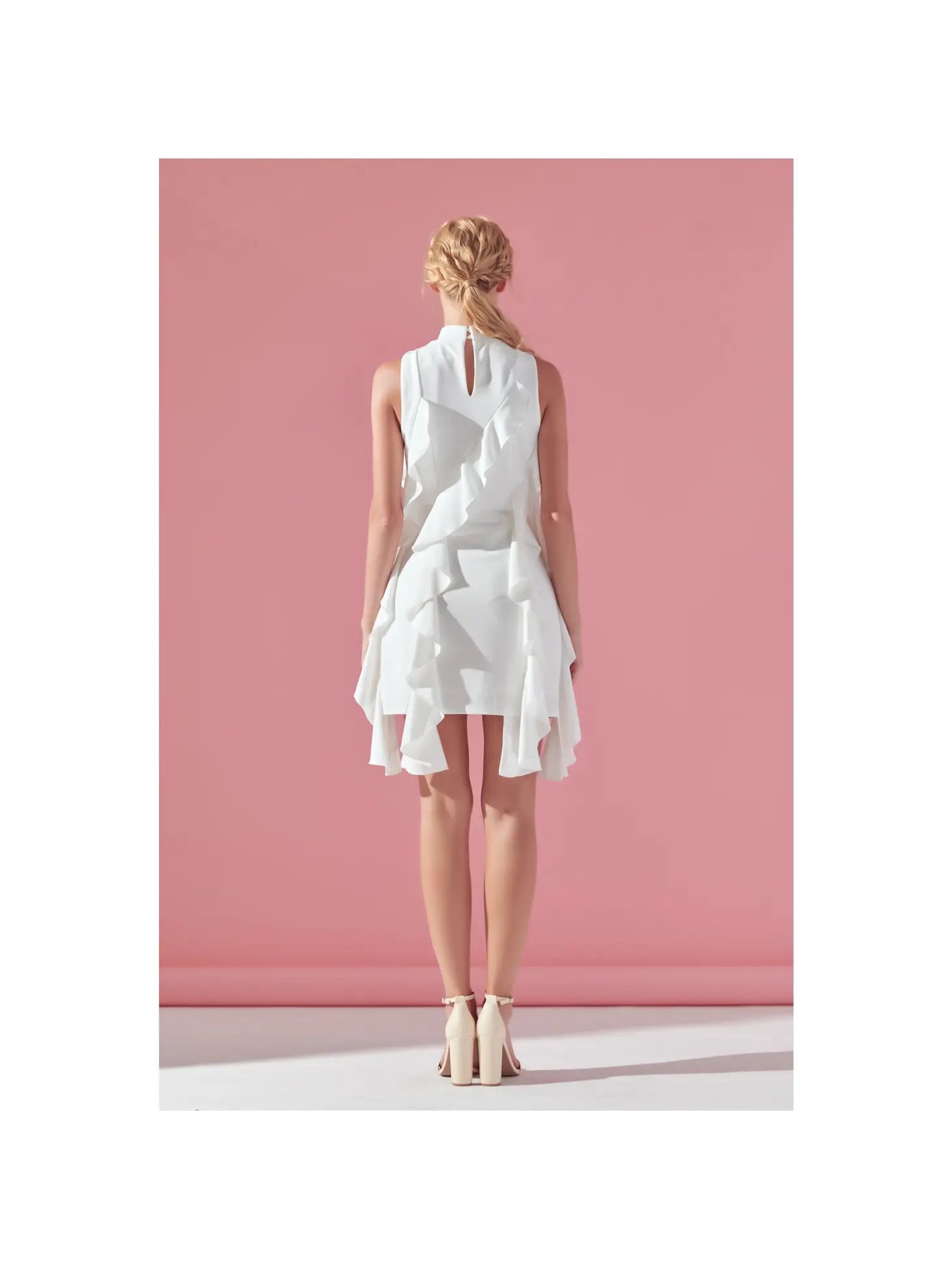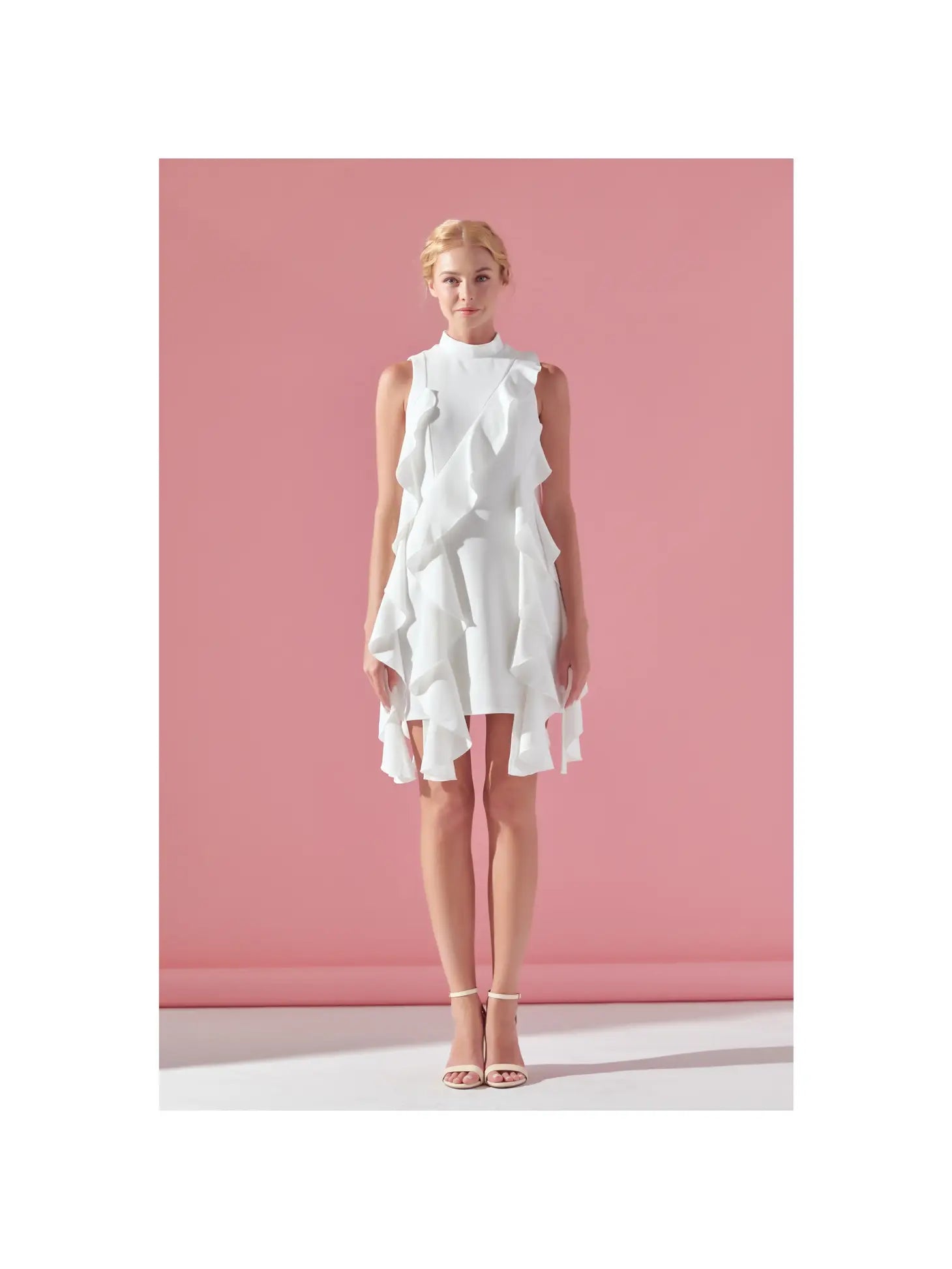 Flaunt your style in the Everlasting Love Dress. This mini dress features playful ruffle details and a mock neck for a trendy touch. The sleeveless design allows for movement and comfort, making it perfect for any occasion.