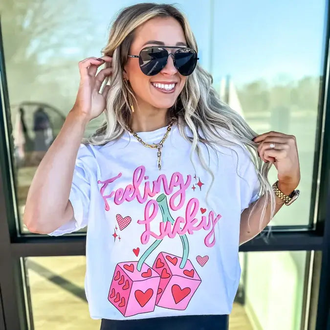Spread good vibes and hit the jackpot with the Feelin' Lucky Tee. Perfect for Valentine's Day, this tee puts a playful spin on the classic lucky charm. Stay in a winning state of mind with this quirky, confident addition to your wardrobe.