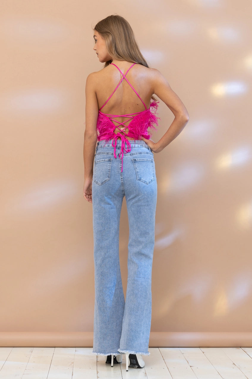 Get ready to ruffle some feathers with our Moroney Feather Top! Featuring a halter neckline and tiered feather design, this lace-up tank will add a playful touch to any outfit. With an open back and adjustable tie closure, this crop top is perfect for a flirty and fun night out.