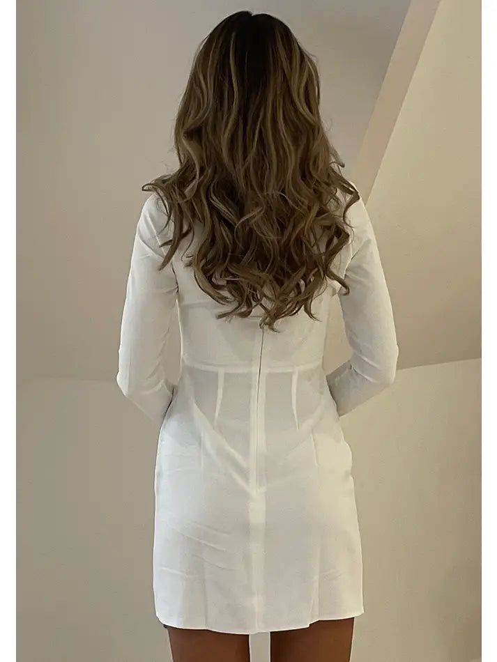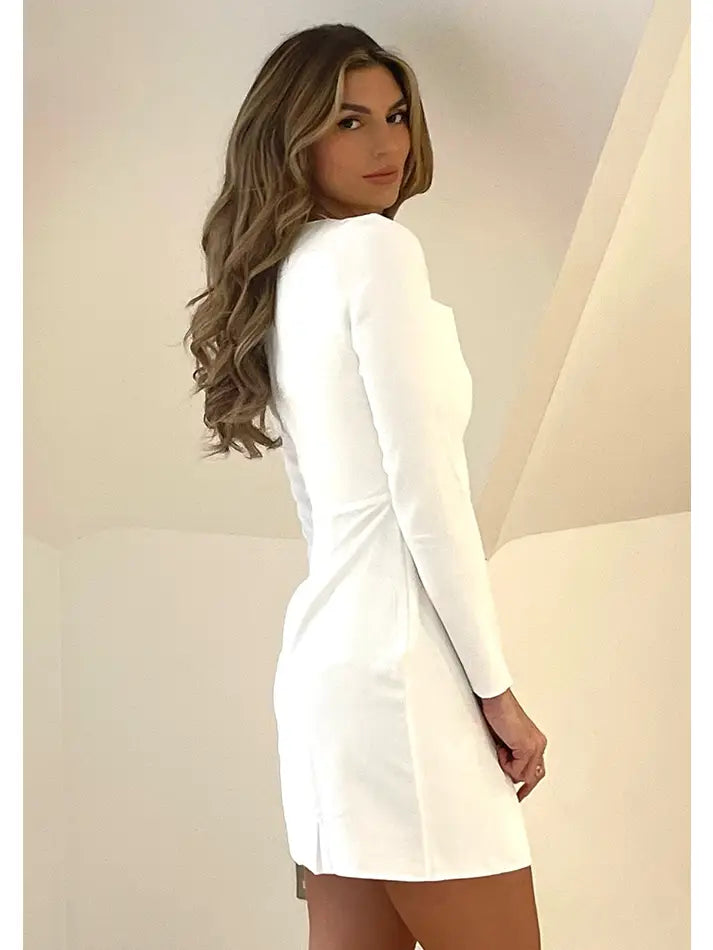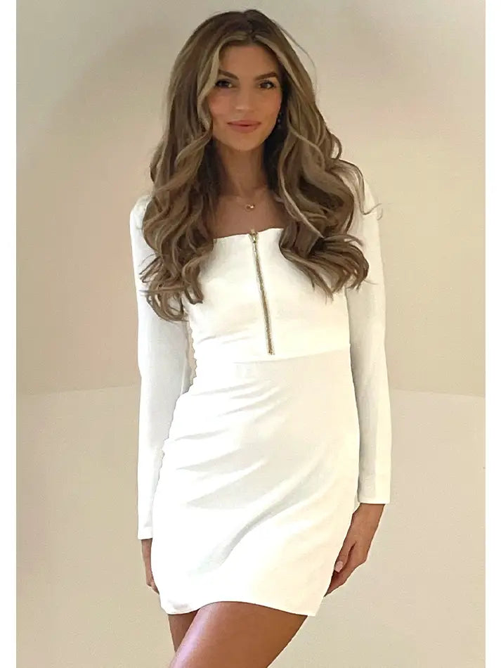 The latest statement mini dress for your collection, Vesper savita ivory long sleeve mini dress. Savita features a square neckline, long sleeves, thin straps to tie around the neck and a decorative gold statement zip at the front bodice. Pair with strappy heels and a clutch bag to complete your look.